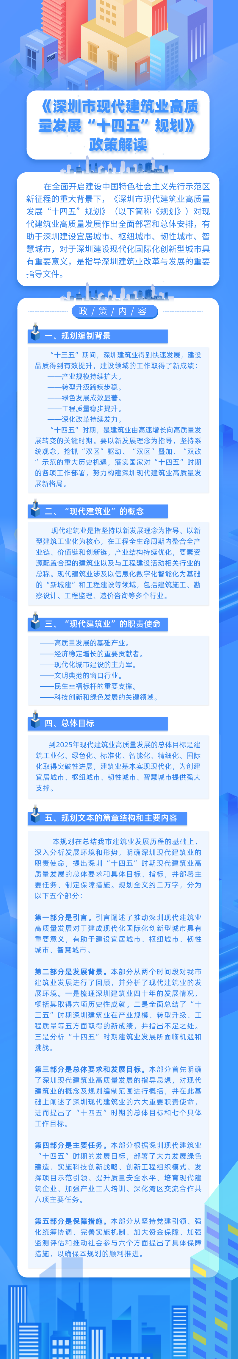 為加快推動現代建筑業高質量發展,近日,深圳市住房和建設局會同市發展改革委聯合發布《深圳市現代建筑業高質量發展“十四五”規劃》(以下簡稱《規劃》),就“十四五”時期深圳市現代建筑業職責使命、發展思路、發展目標、主要任務作了系統闡述。“十四五”時期深圳市新建民用和工業建筑將全面執行綠色建筑標準,新增高星級綠色建筑不少于500個。